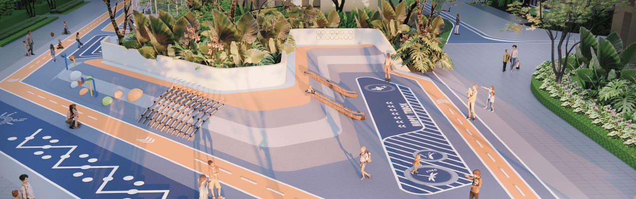 运动体系:600米健康跑道+健身器械区+社区体育场地,地面采用悦动铺装,周边种植大腹木棉、现代月季,运动同时享受花香与绿意。