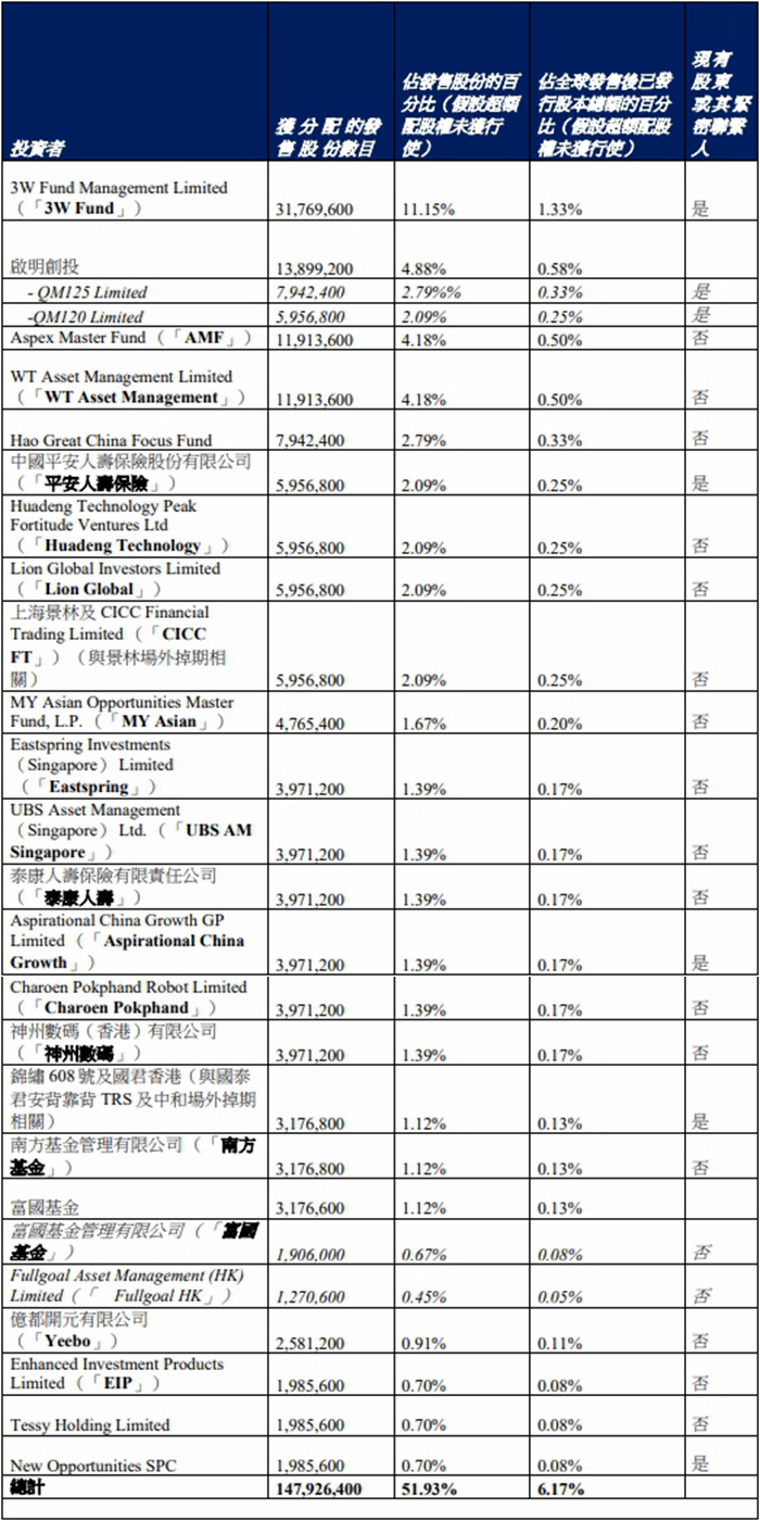 根据最终发售价及配发结果公告,壁仞科技本次发售股份数目(超额配股权获行使前)为284,846,600股股份,其中,公开发售的发售股份最终数目(在重新分配后)为49,538,600股股份,国际发售的发售股份最终数目(在重新分配及发售量调整权获悉数行使后)为235,308,000股股份。壁仞科技于上市后已发行的股份数目(超额配股权获行使前)为2,396,131,700股股份。