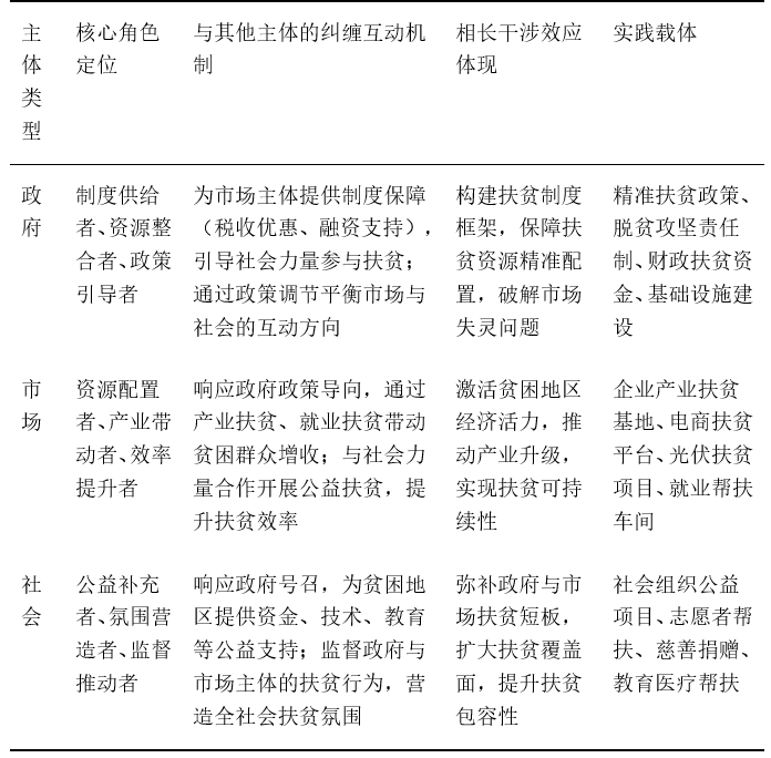 量子经济学认为,中国脱贫攻坚的奇迹,本质是“政府-市场-社会”多元主体形成的纠缠关系,通过协同治理产生相长干涉效应,推动贫困地区系统能量积累突破临界阈值,实现从“贫困状态”到“脱贫状态”的能级跃迁。三者的纠缠关系、角色定位与干涉效应可通过下表3清晰呈现: