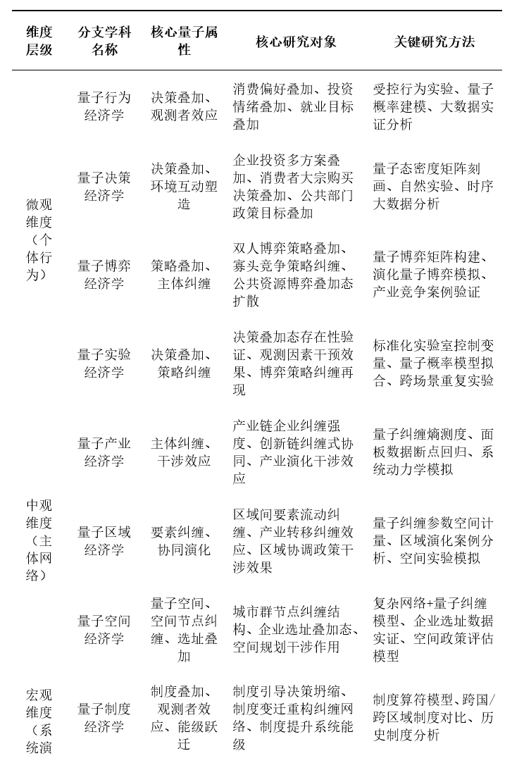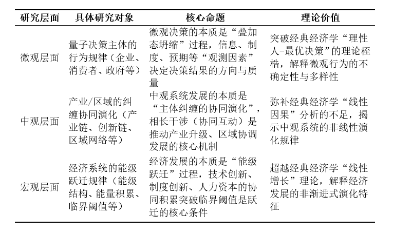 明确研究对象是界定学科边界的核心,量子经济学以“涵盖微观、中观、宏观的复杂经济系统”为研究对象,打破了经典经济学“微观-宏观”的二分割裂,实现了三个层面的逻辑融通。其具体研究对象、核心命题与理论价值可通过下表1清晰呈现: