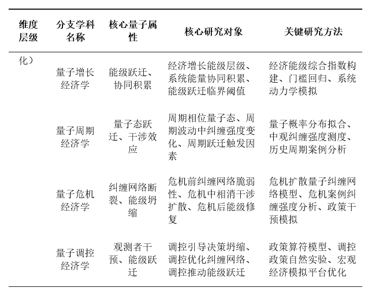 综上,量子经济学的分支体系以微中宏维度为框架,形成“微观决策叠加-中观主体纠缠-宏观能级跃迁”的完整理论闭环:微观分支揭示个体行为的量子逻辑,为整个体系提供微观基础;中观分支解释主体网络的协同演化,搭建微观与宏观的连接桥梁;宏观分支刻画系统演化的能级规律,彰显理论的系统价值。各分支既通过核心量子属性实现有机联动,又依托权威理论与实证方法构建严谨的研究范式,不仅为复杂经济现象提供了全新的解释工具,也为构建中国自主的现代经济学知识体系提供了具象化的实践路径。
