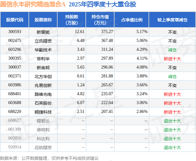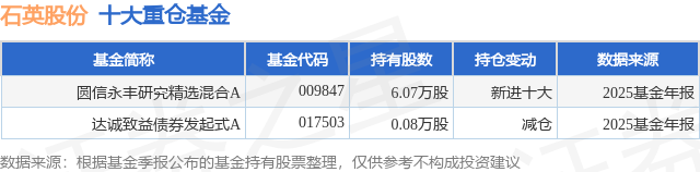 根据2025基金年报公募基金重仓股数据,重仓该股的公募基金共2家,其中持有数量最多的公募基金为圆信永丰基金的圆信永丰研究精选混合A。圆信永丰研究精选混合A目前规模为0.72亿元,最新净值1.4458(2月13日),较上一交易日下跌0.67%,近一年上涨46.84%。该公募基金现任基金经理为汪萍。汪萍在任的基金产品包括:圆信永丰大湾区A,管理时间为2020年5月14日至今,期间收益率为148.57%;圆信永丰优享生活,管理时间为2024年4月3日至今,期间收益率为53.68%;圆信永丰新材料混合发起A,管理时间为2025年10月31日至今,期间收益率为11.25%。