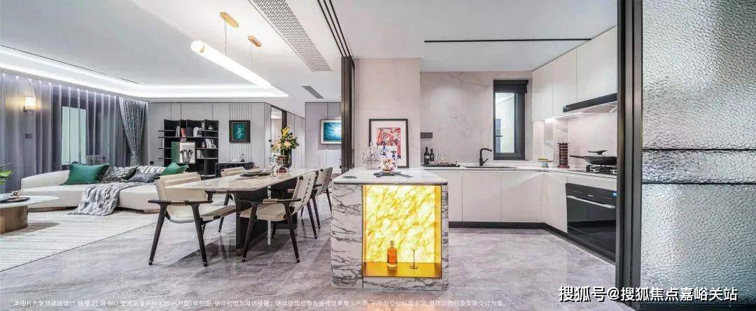 上面储物柜,下面鞋柜,中间置物区采用凝脂玉石材,鞋柜更配置鞋柜精灵;无论大小户型,厨房岛台都是标准配置,大面积岩板同样是交付标准;