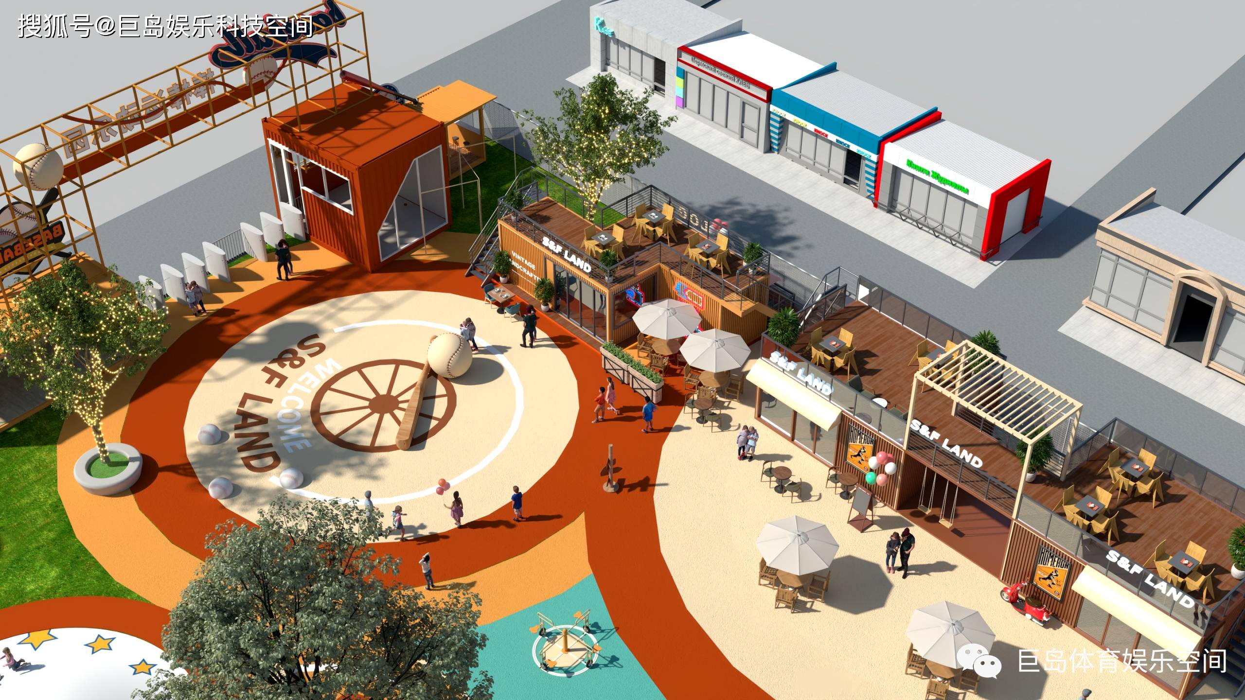 入口广场:红色拱形门头搭配白色棒球缝线纹理,地面铺设蓝色星空地绘,致敬纽约扬基队主场风格;