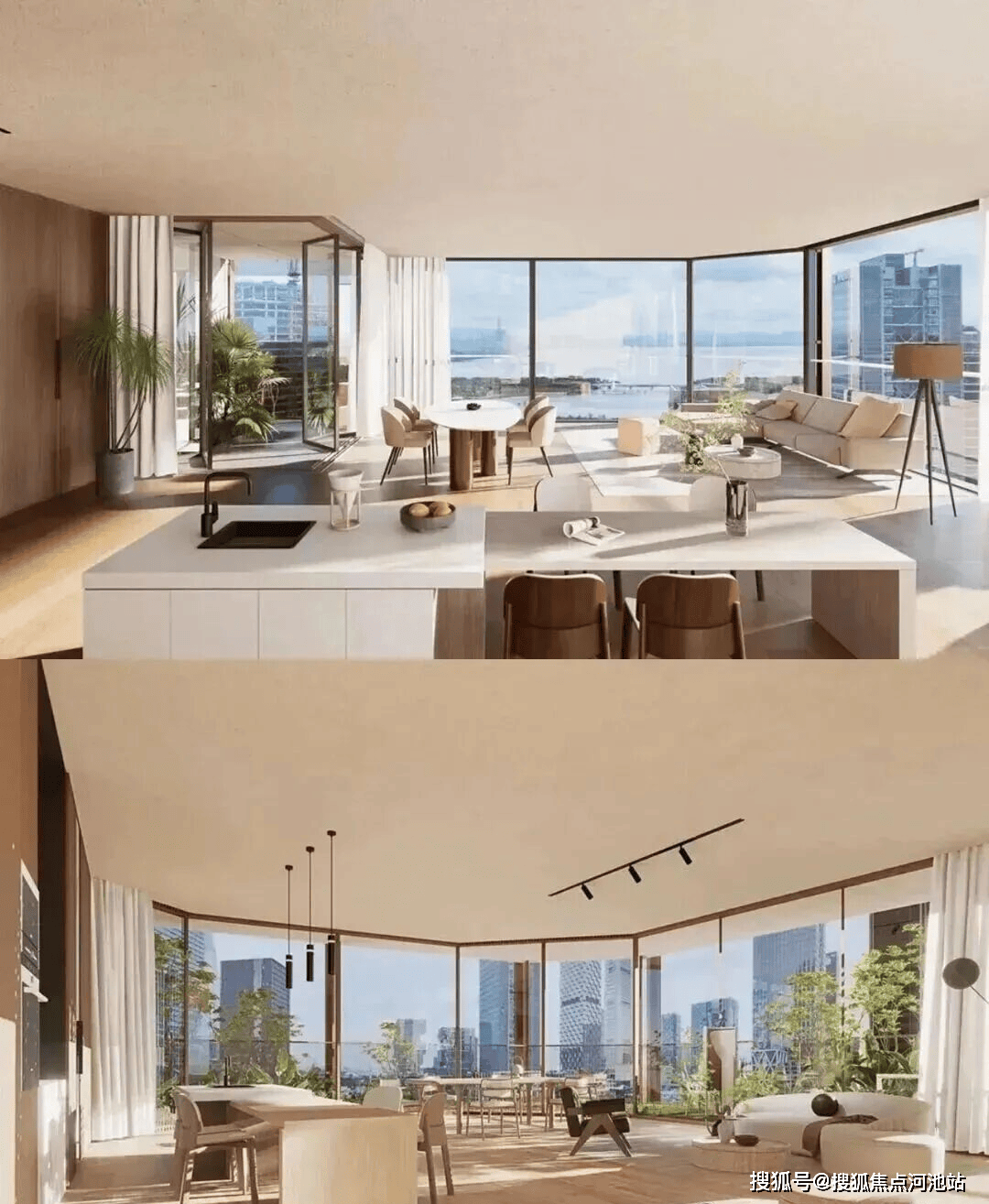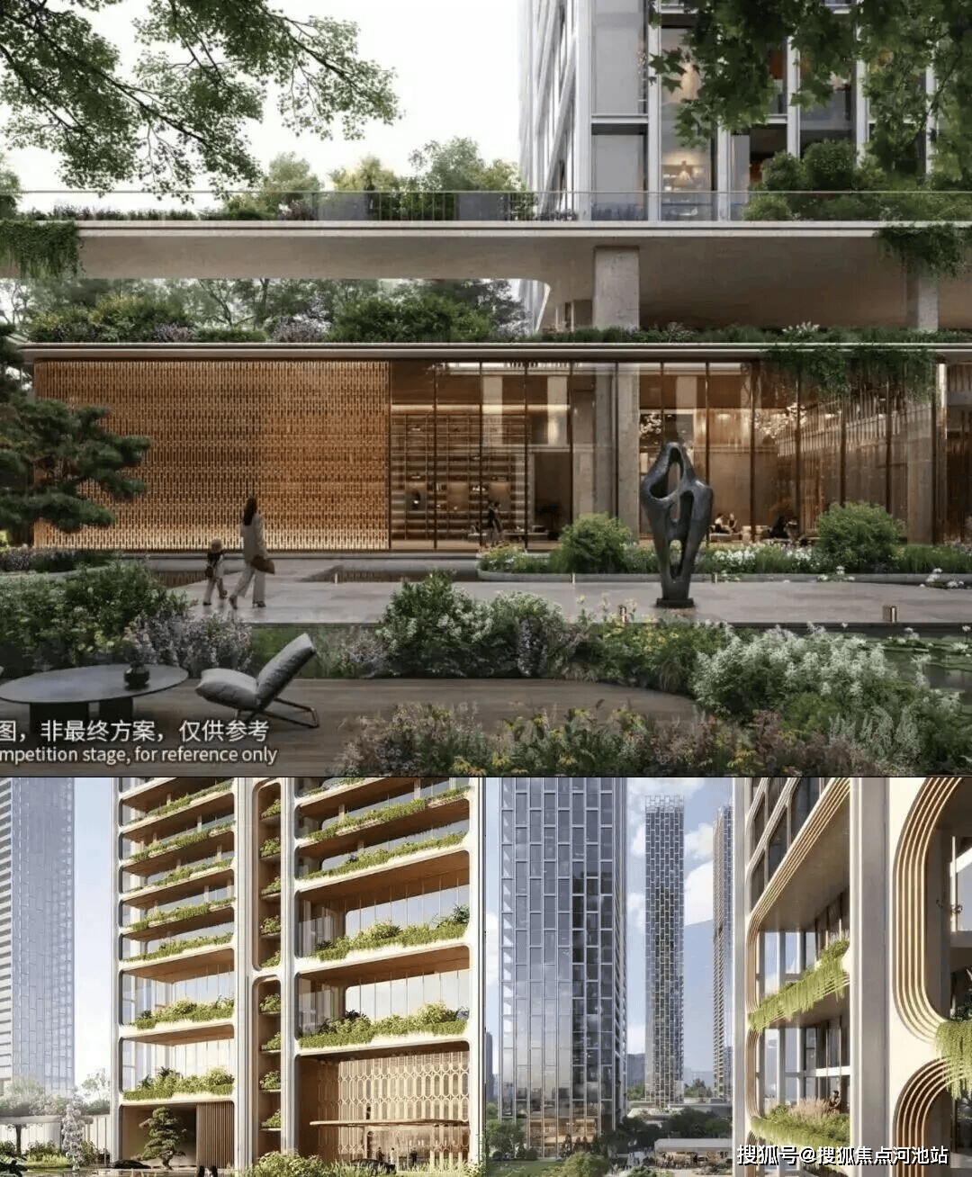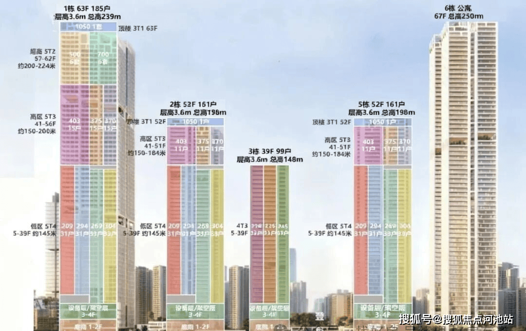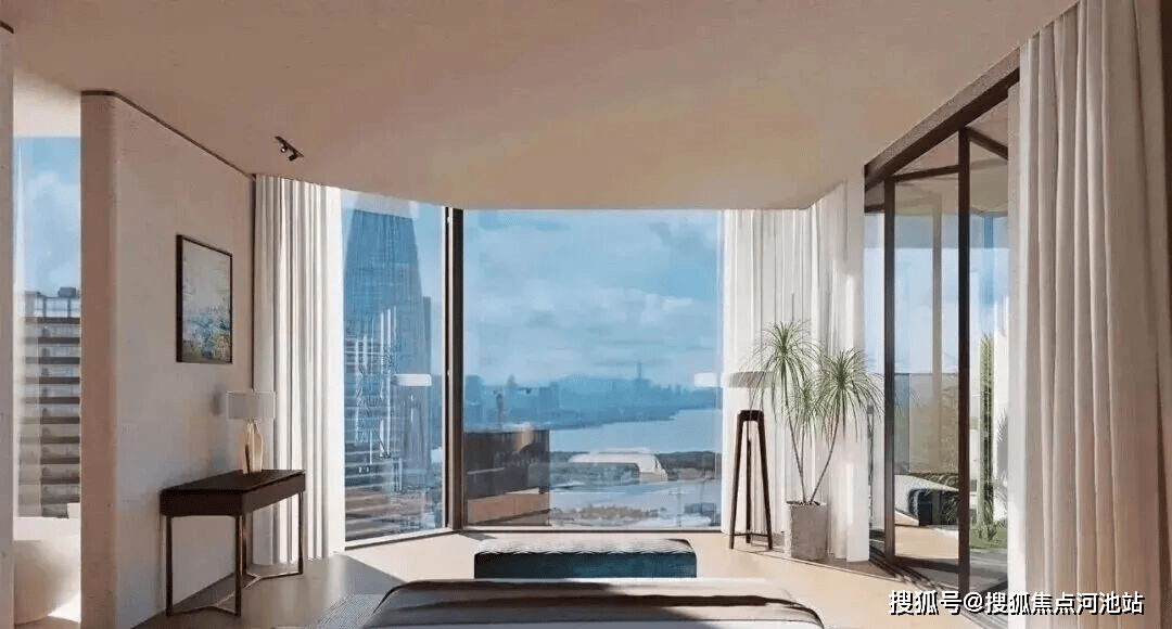项目规划5栋超高层住宅,采用全玻璃幕墙设计,实用率超95%,主力户型为209㎡以上大平层。项目以“第四代住宅”标准打造,配备空中连廊、星空会所、架空泳池等共享空间,并融入垂直绿化体系