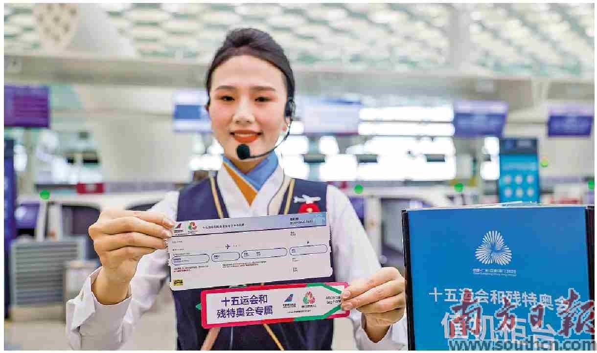 南航在深圳宝安国际机场设立“十五运会和残特奥会”专属值机柜台,配备业务骨干全天值守,并启用印有赛事Logo的新版纸质登机牌,兼具出行工具、纪念价值与服务功能。