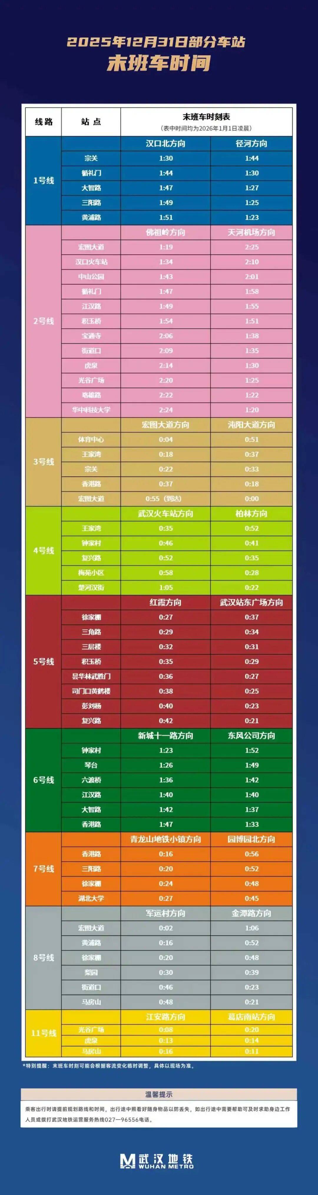 ◆为保障市民游客出行,武汉地铁提前部署专项方案。12月31日当晚,1、2、6号线小时,末班车发车时间为次日(1月1日)凌晨1时;3、4、5、8、11号线号线(园博园北—青龙山地铁小镇)延时运营1小时,末班车发车时间为次日0时。当日,全线最晚收班时间将延至1月1日凌晨2时44分。