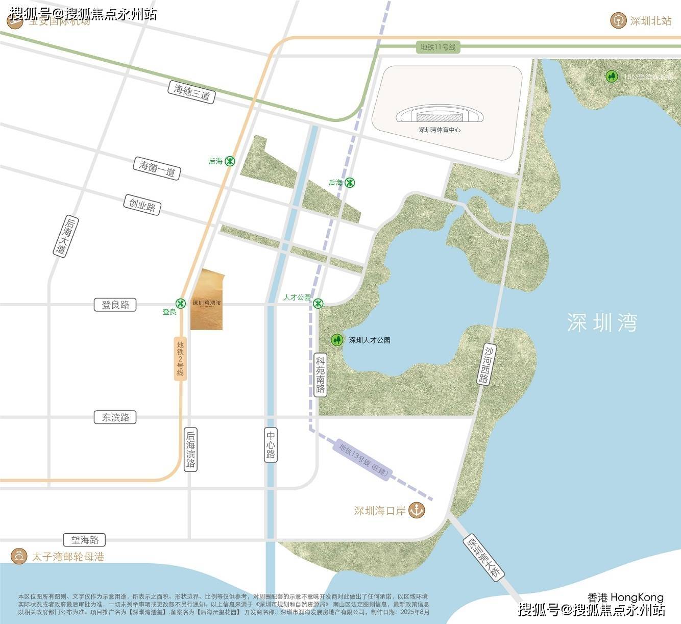项目位于南山区粤海街道逸湖二街与后海滨路交汇处,东临深圳湾公园,西接后海总部基地,北靠人才公园,南望深圳湾海域,占据粤港澳大湾区核心区位。