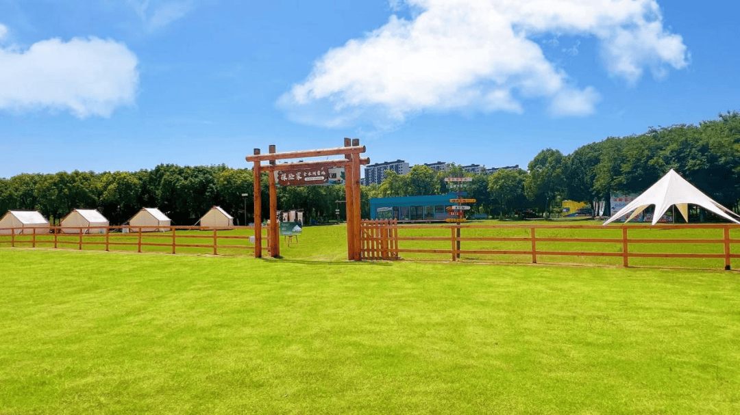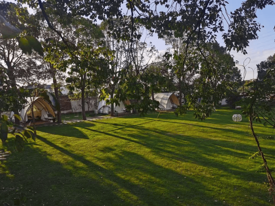 亨嘉庄占地170余亩,四周农田环抱、村落星布,绿树成荫间碧波点缀,宛如都市旁的田园秘境。作为全国休闲农业与乡村旅游四星级示范园区,这里以“农业+文化+旅游”为核心,休闲娱乐场景丰富多元。草坪上错落排列的白色帐篷提供独特住宿体验,皮划艇、真人cs团建、生日趴等户外活动满足不同需求,篝火晚会、露天电影、移动酒吧车则为夜晚增添惬意氛围。