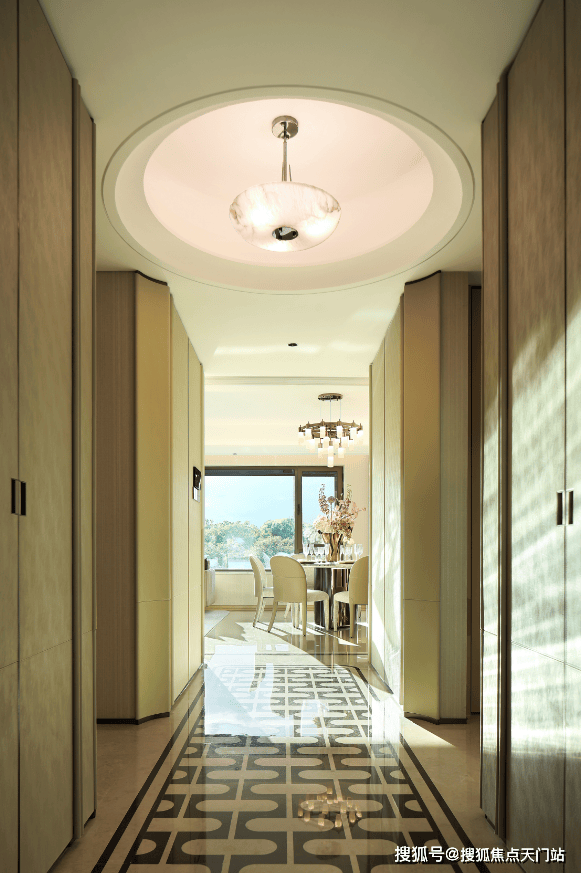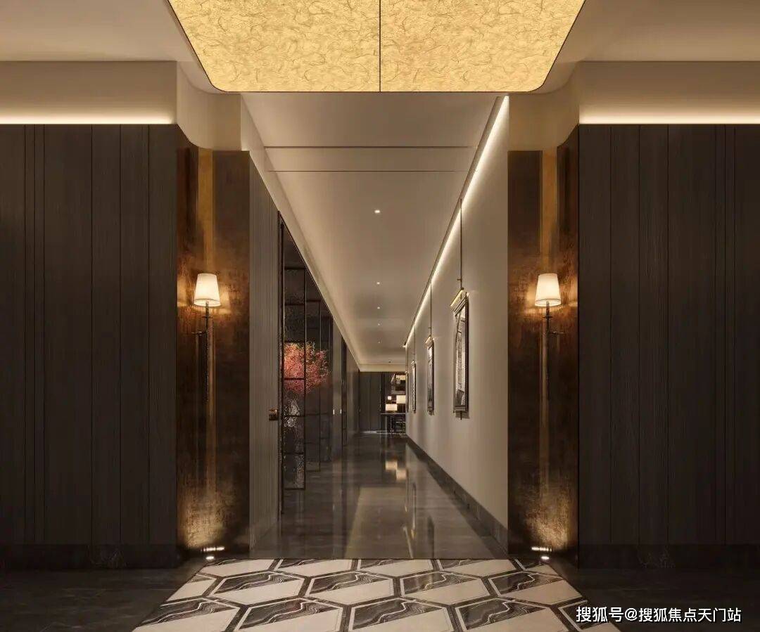 电梯厅成为私享空间。入户玄关采用奢石与水刀拼花工艺,营造出强烈的归家仪式感和尊贵体验。