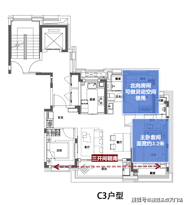 3号楼为两梯两户设计,拥有独立电梯厅,同样布局东侧约102㎡三房与西侧约184㎡四房。