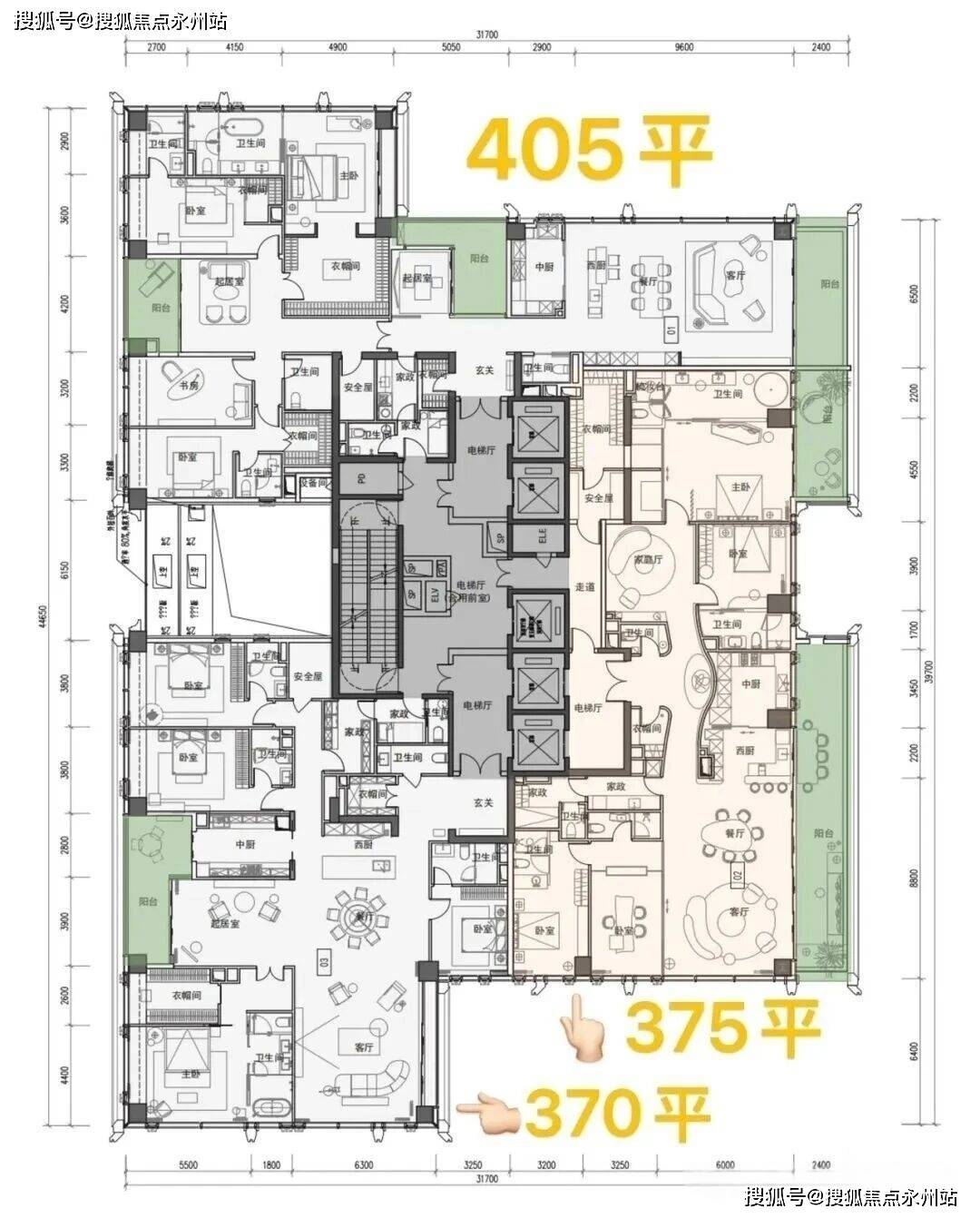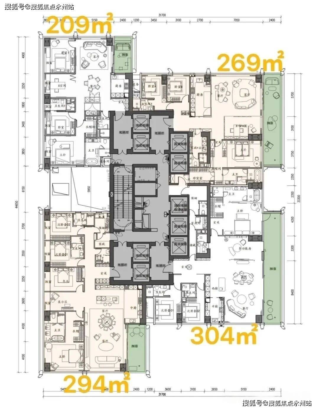 规模规划:占地3.85万㎡,总建面26.3万㎡,由5栋超高层塔楼组成(4栋住宅+1 栋公寓),住宅主力户型为209-1050㎡纯粹大平层,共601套,容积率7.59,限高250米。