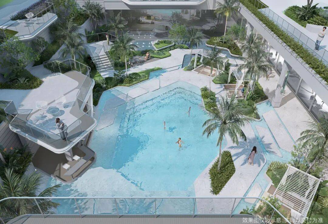 下沉式浮岛会所,现代水岸度假之境;精研新奢度假六境,将度假带入日常,呈现给业主归家即度假的社区空间