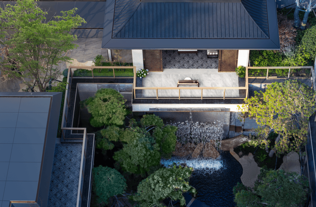 下沉式浮岛会所,现代水岸度假之境;精研新奢度假六境,将度假带入日常,呈现给业主归家即度假的社区空间