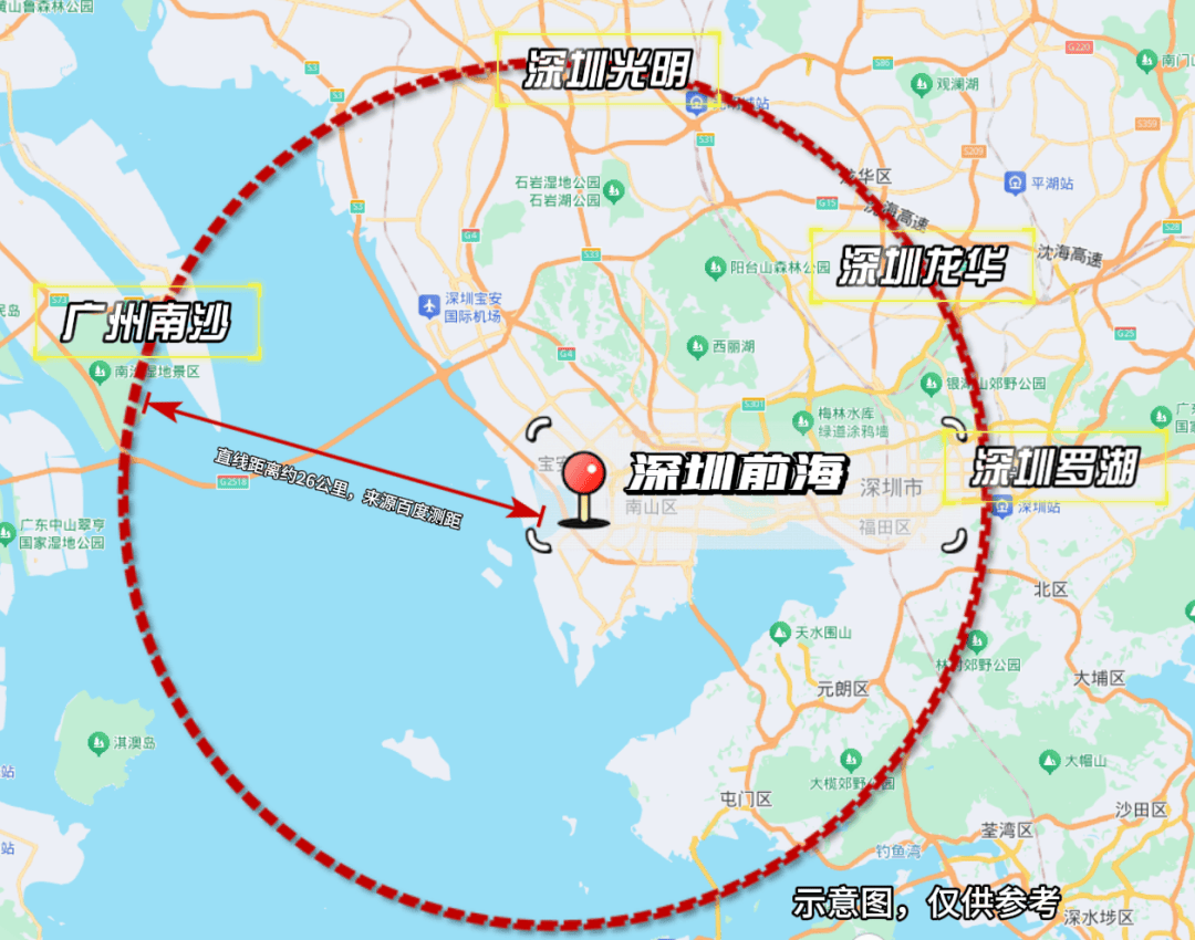 摊开地图,南沙与前海仅隔了一片伶仃洋,与前海同频共振,天然承接前海庞大的产业、人口外溢,构成一个30分钟经济圈。