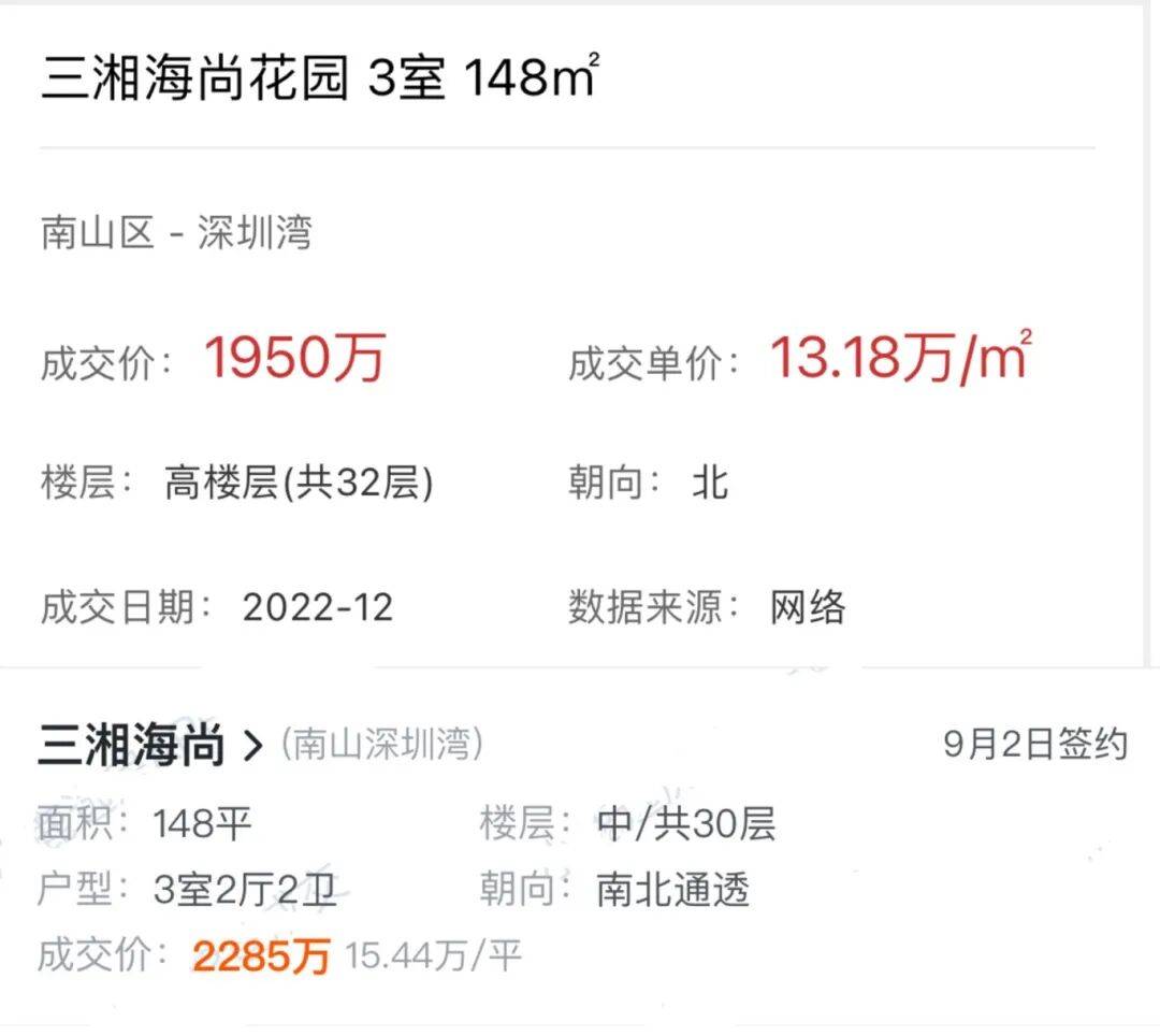 这样的产品形态,让人不由联想到深圳湾的标杆——三湘海尚。作为深圳湾罕见的低密大盘,它以深圳湾最低容积率2.0、纯板式大平层、超大观景阳台、公园式社区著称,即便在近年市场调整中,依旧逆势上涨数百万。