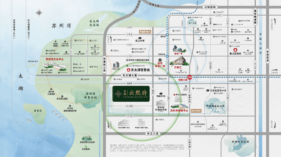 政务中心(吴江太湖新城管委会)、大型商业(万象汇、吾悦广场)、文化地标(苏州湾文化中心、大剧院)都在咫尺之间。孩子上学有苏州湾外国语学校等一众名校环绕;家人健康有约1公里外的苏州市第九人民医院(三甲)保驾护航。